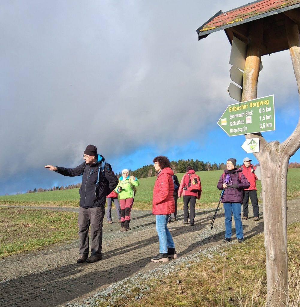 Nun war aber Schluss mit lustig, es ging nämlich steil bergan zu Spornreuth-Aussicht. Dort bewunderten wir, inzwischen bei Sonnenschein, die Erlbacher Bergwelt.