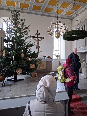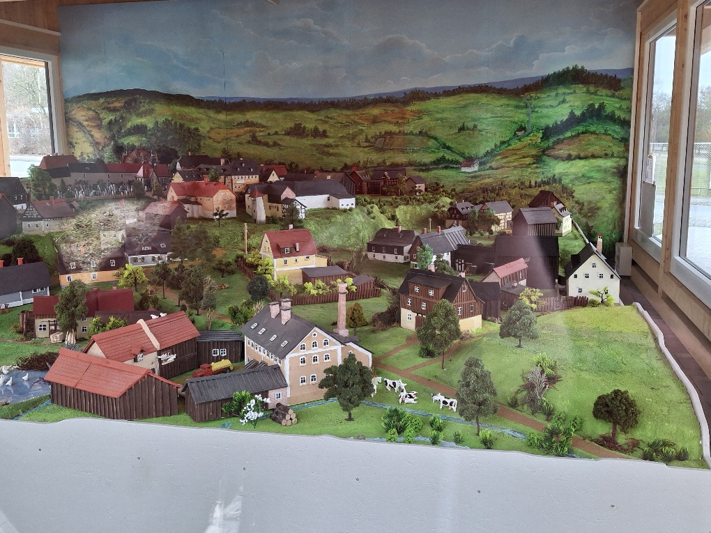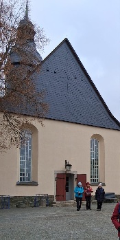 Die Route führte uns nun über einen Höhenweg nach Alt-Jocketa. Schon von weitem war die Kirche zu sehen, die dort 1965 als originalgetreuer Nachbau des früheren Pöhler Gotteshauses errichtet wurde. Der Gottesdienst war gerade zu Ende und wir erhielten Kirchenzutritt und einen spontanen, sehr interessanten Vortrag mit persönlichen Erinnerungen zur Kirche und zum versunkenen Ort Pöhl durch Herrn Thilo Lehmann (ehemaliger Geschäftsführer der gleichnamigen Firma). Das detailgetreu nachgebaute Modell des Ortes konnten wir anschließend im neuen Pöhl-Pavillon gegenüber dem „Talsperrenblick“ bestaunen.