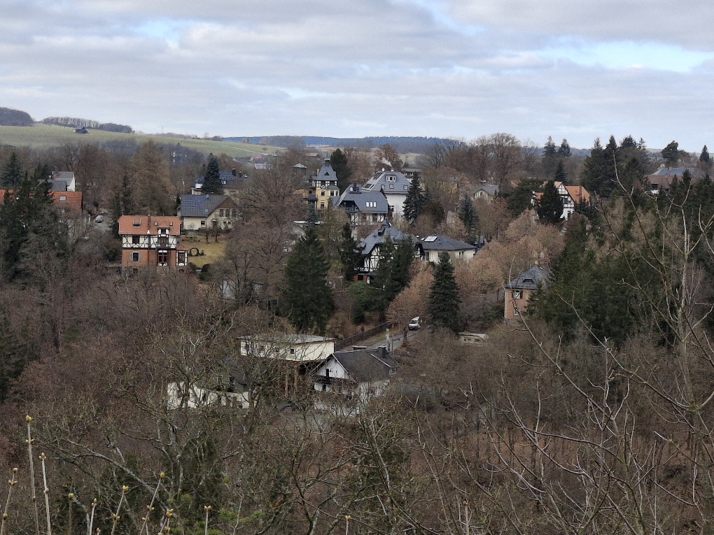 Da der bequeme Weg ins Triebtal wegen Steinschlag gesperrt war, nahmen wir den steileren Abstieg zum Tosbecken hinunter. Kein Problem für meine geübten Wanderer. An der Trieb entlang ging´s zur Pyramidenwiese und dann hinauf auf den Eisenberg zur Friedenshöhe. Die Elstertalbrücke und die stattlichen Villen von Jocketa sind von da aus im Winter besonders gut zu sehen.