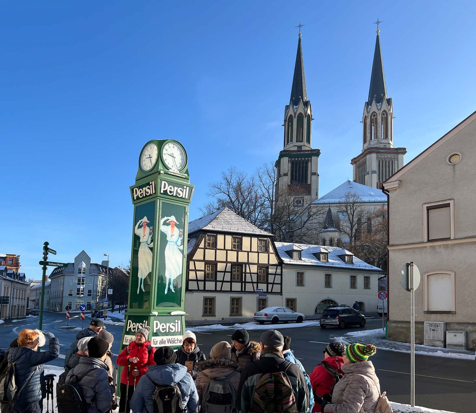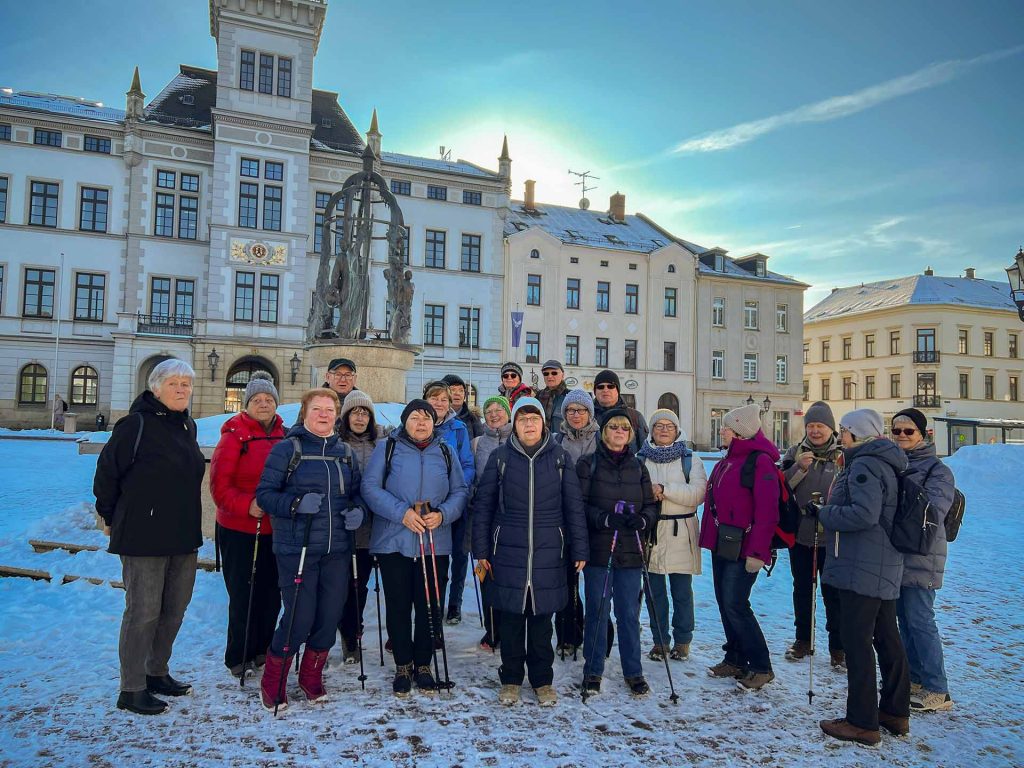 Am 04.02.2026 fuhren 19 Naturfreunde und 2 Gäste mit der Bahn nach Oelsnitz (Vogtland). Da die Straßen- und Gehwegverhältnisse zum Wandern ungünstig waren, wurde die geplante Wanderroute nach Unterhermsgrün/Dreihöf kurzfristig in eine kleine Stadtführung umgewandelt. Glücklicher Umstand war, dass Katharina ein echter Sperk ist und sich in Sperkonien bestens auskennt. Sie führte uns durch Oelsnitz und konnte auch einige Anekdoten beisteuern.