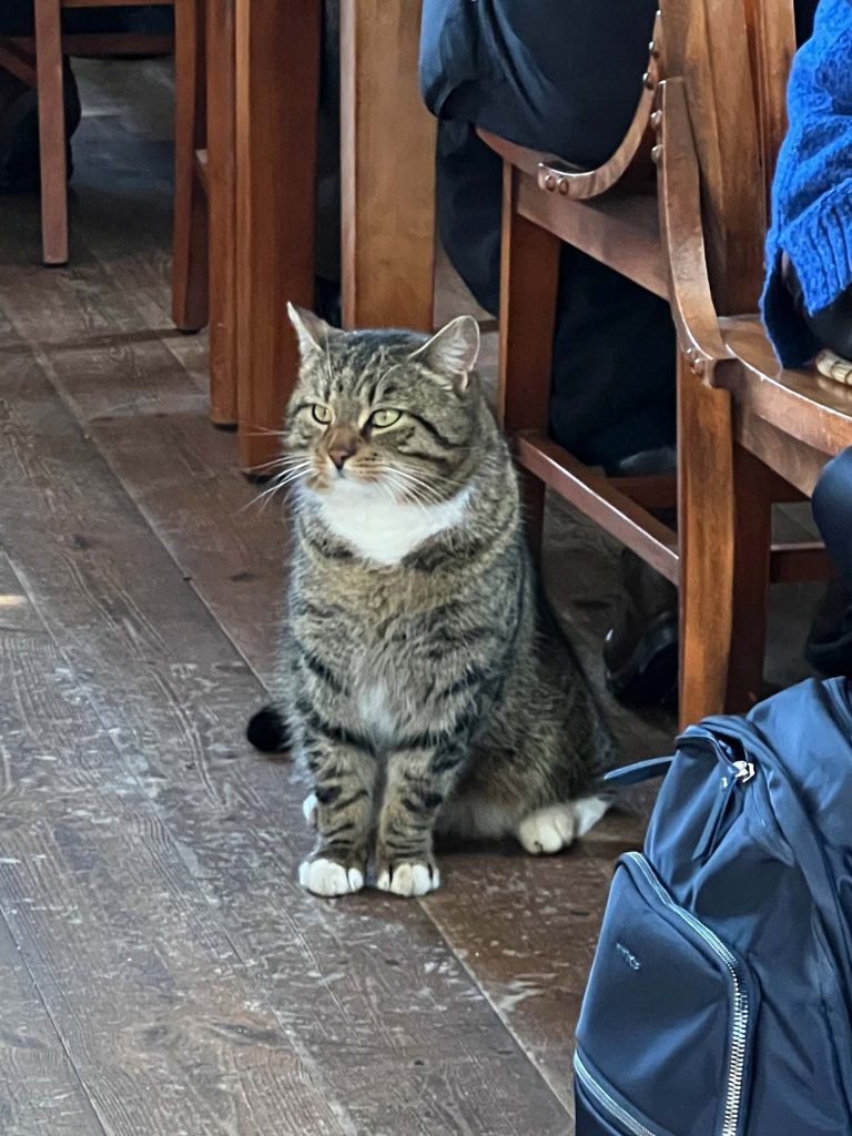 In der Tourist-Information im Zoephelschen Haus, einem Fachwerkhaus und eines der ältesten Häuser von Oelsnitz, besorgten sich einige noch schnell ein paar Informationen. Mit einem vom Wanderleiter Peter Seibt noch am Vortag organisierten Rufbus fuhren wir vom Bahnhof Oelsnitz nach Dreihöf zur Gaststätte. Dort empfingen uns freundliches Personal, leckeres Mittagessen und die Hauskatze.