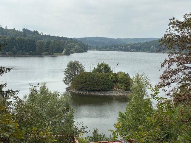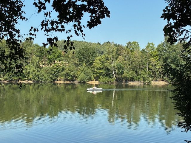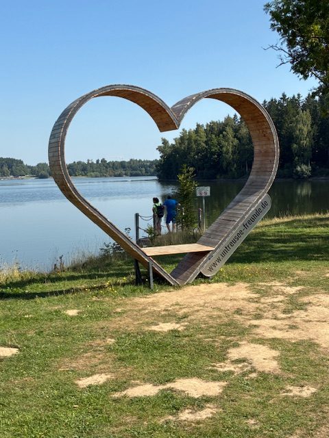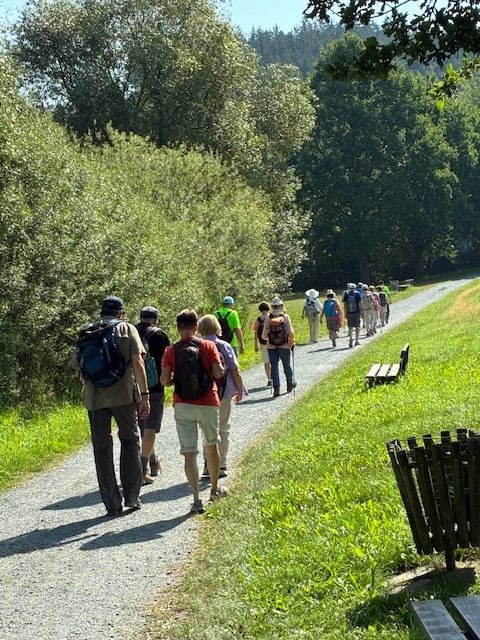 Unsere Wanderung begann am Parkplatz am Minigolfplatz. Der Seeblick auf den Untreusee war mit den Windspielen auf der Insel unser erster Eindruck vom gepflegten Erholungsgebiet „Untreusee“. Vorbei am Kletterwald und am Labyrinth erreichten wir auf schattigem Wege den Photopoint „Herz“. Der Blick durch das Herz mit Hintergrund des Untreusees wurde oft mit dem Handy festgehalten. Nach dem Seeübergang (Brücken) erfolgte eine Rast am Wegesrand auf schattigen Bänken. Entlang des Untreusees kamen wir an die Liegewiese, wo wir rechts auf einen Feld- und Waldweg abbogen. Bergan ging es in Richtung Schaumberg, wo die Wandergruppe in Oberkotzau ankam. Der Schwarze Weg führte uns auf den Saaleradweg, hier erfolgte die nächste Trinkpause. Im Schatten der Bäume ließ sich im Saaletal herrlich wandern. Nun erreichten wir Moschendorf und vorbei am „Biller“ führte uns der Weg zum Staudamm. Hier und zu vielen anderen interessanten Punkten gab der Wanderleiter detaillierte Informationen. Am Ende der Wanderung bedankten sich die Wanderleiter Henry und Frank bei den Wanderern für das Durchhalten bei tropischen Temperaturen.