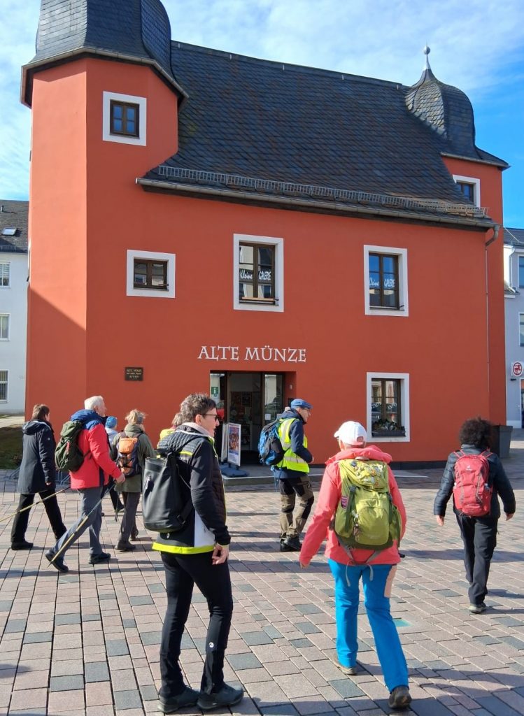 Vorbei am Rathaus erreichten wir über das Apothekergässchen das Gelände des ehemaligen Schlosses, heute sind nur die zwei Türme zu sehen, da es in Schleiz häufiger brannte. Gleich nebenan gelangten wir zum Schlosspark der natürlich erst im Frühjahr richtig sehenswert ist. Bald waren wir dann am Neumarkt mit der „Alten Münze“ angekommen. Nicht weit davon vor der Kreissparkasse, war ein Gruppenfoto am „Wisent“ Pflicht.