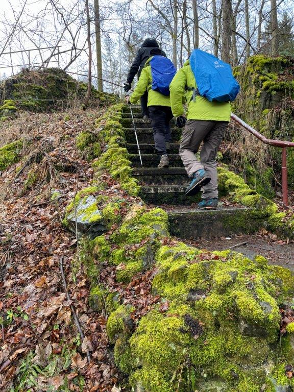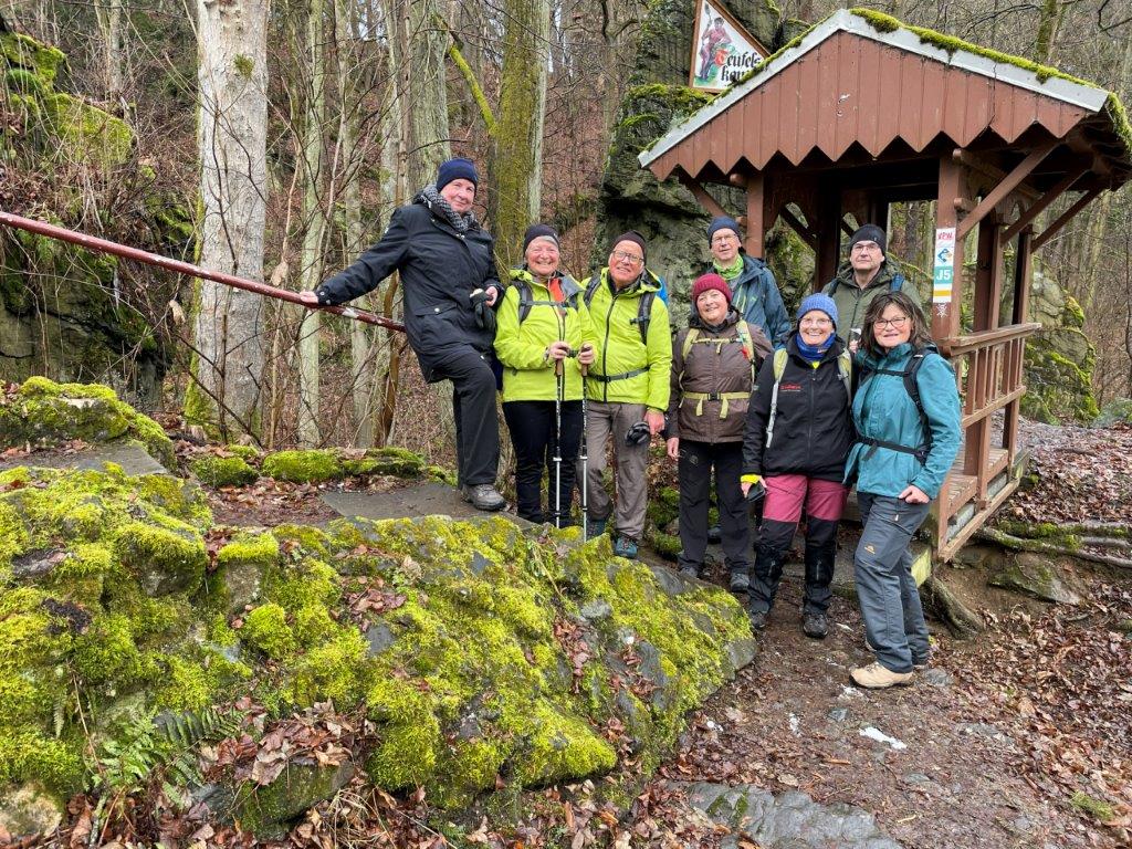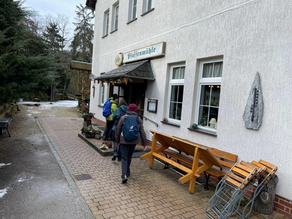 Entlang am „Pfad der Bäume des Jahres“ verlief die Wanderung bis zur Teufelskanzel, eine Formation aus Grünsteinfelsen. Durch das Nymphental, entlang des Kaltenbachs ging es bis zur Pfaffenmühle. Bevor wir dort zum Essen einkehrten schauten wir uns die kleine Ausstellung in der alten Gaststube an. Nach dem guten Mittagessen wurden die letzten km bis zum Ziel der Straßenbahnhaltestelle über den Ortsteil Althaselbrunn auch noch gut gemeistert.