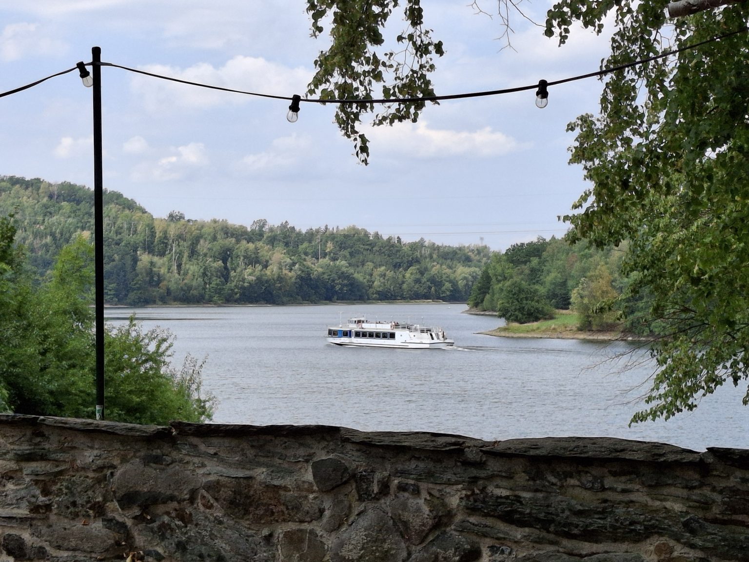 Auf gut begehbaren Wald- und Wiesenwegen kamen wir im großen Bogen am Segelclub, am Rand vom Golfplatz und am Schöpferstein vorbei. Unterwegs bot sich ein toller Blick über die Länge der Talsperre bis hin zur Staumauer. Weiter ging´s nun in Ufernähe an der Bungalowsiedlung Voigtsgrün vorbei, und bald schon war der spitze Kirchturm von Altensalz zu sehen.